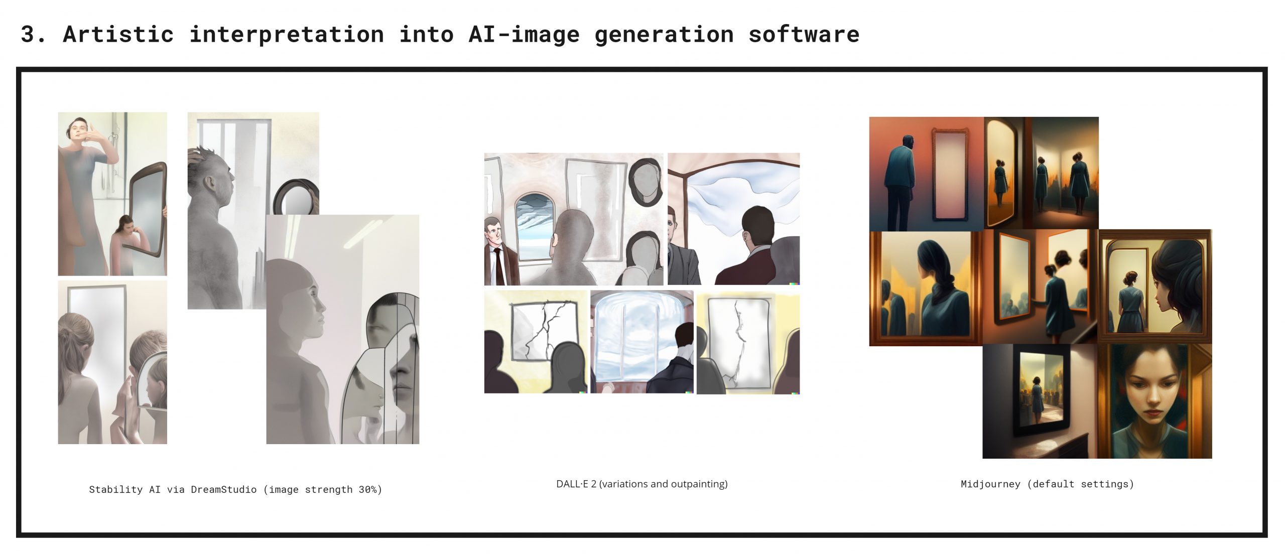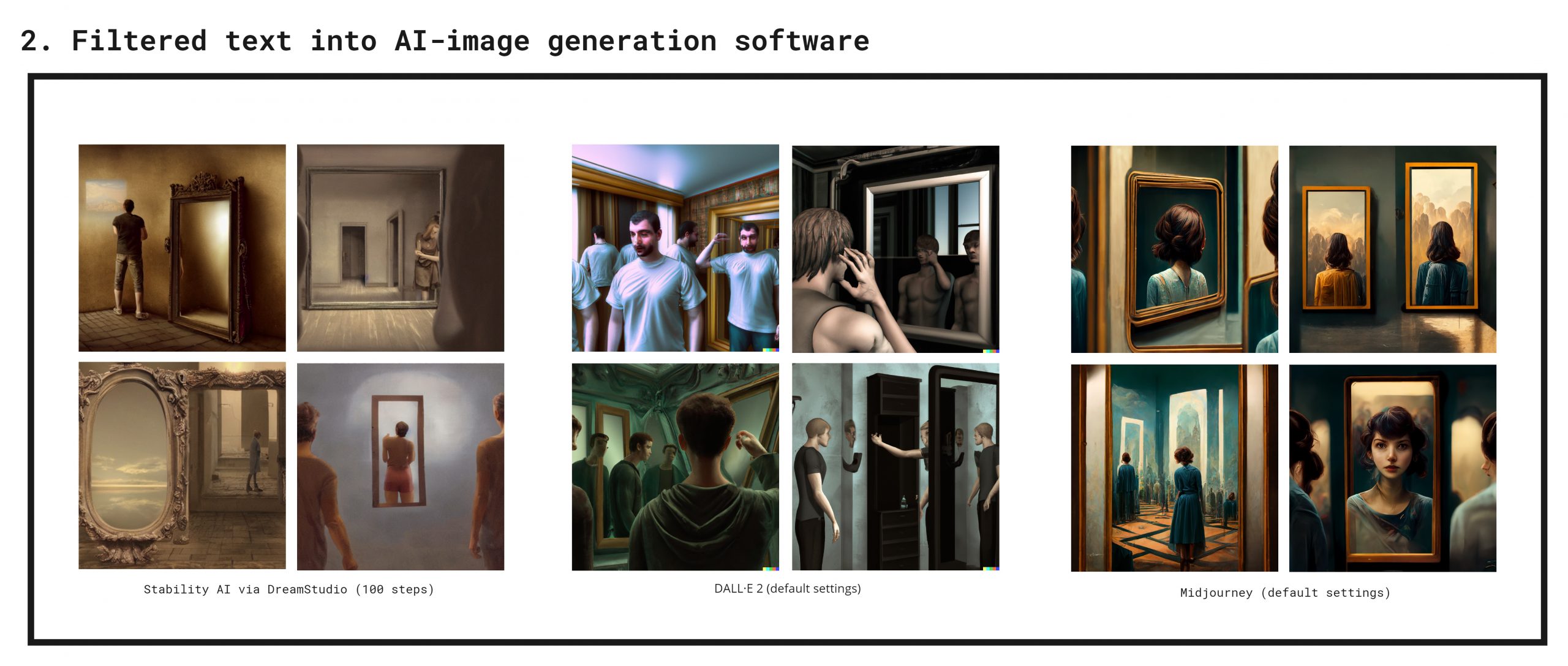 In my first approach, I loaded the raw text prompt into different AI-image generation tools: Stability AI, DALL·E 2 and Midjourney. With each tool, I produced two separate runs of four images. I selected four out of the eight that resonated the most. Each tool has its styles and merits and deals with this kind of ‘raw’ prompting differently. I won’t dig in here, my primary interest is to explore avenues amongst a vast array of possibilities for communicating and integrating this experience.